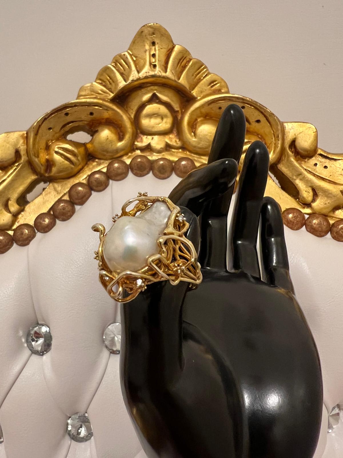 Anello perla barocca in argento 925 lavorato con placcatura in oro 18kT e con 4 piccoli punti luci Swarovski