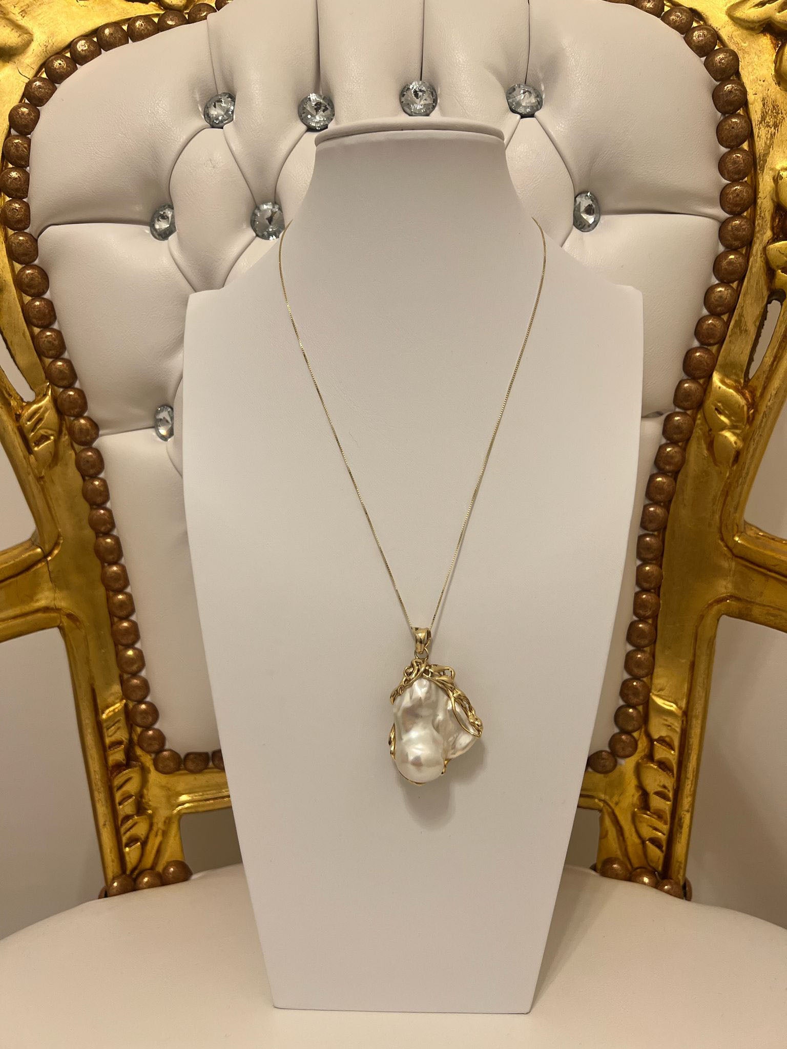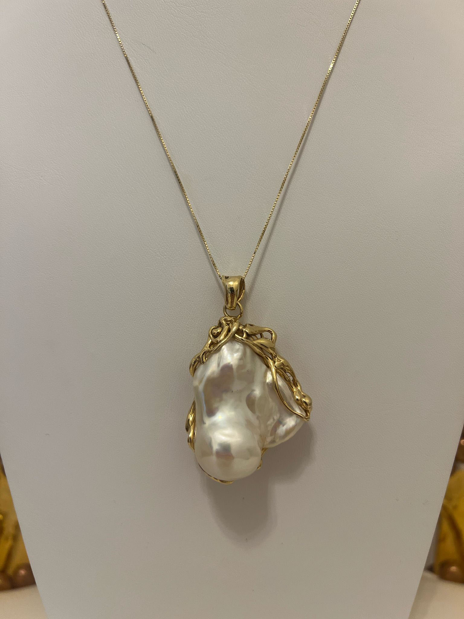Ciondolo in maxi perla barocca naturale con struttura argento lavorato 925, bagno d’oro 18kt