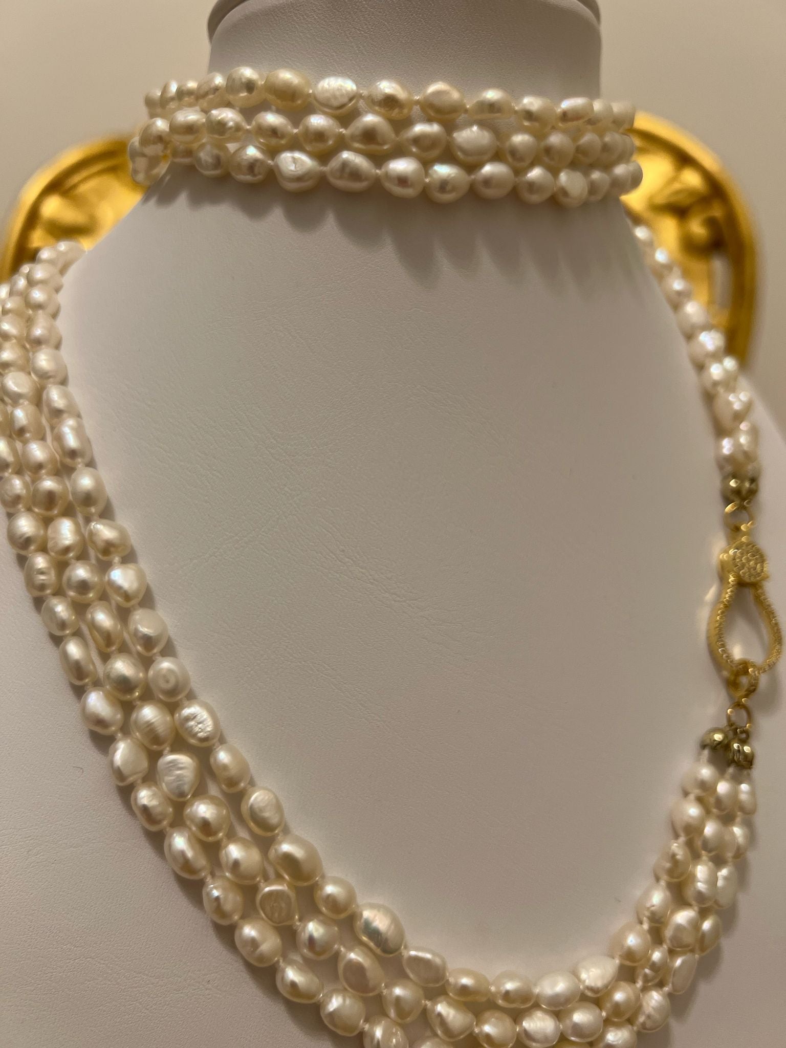 Collana lunga perle di fiume forma chicchi di riso con chiusura brillantinata in acciaio possibilità di essere indossata in diversi modo nel collo