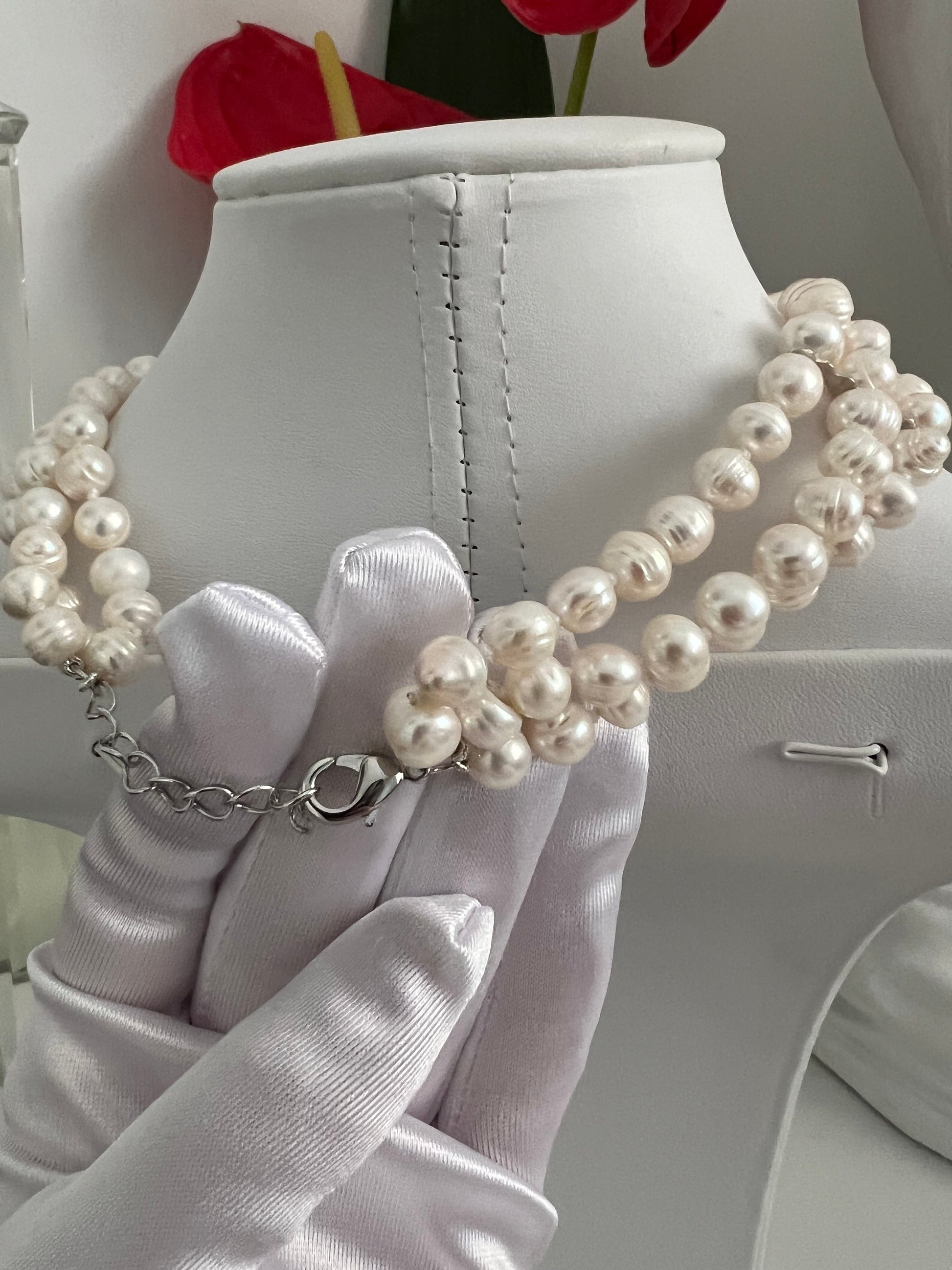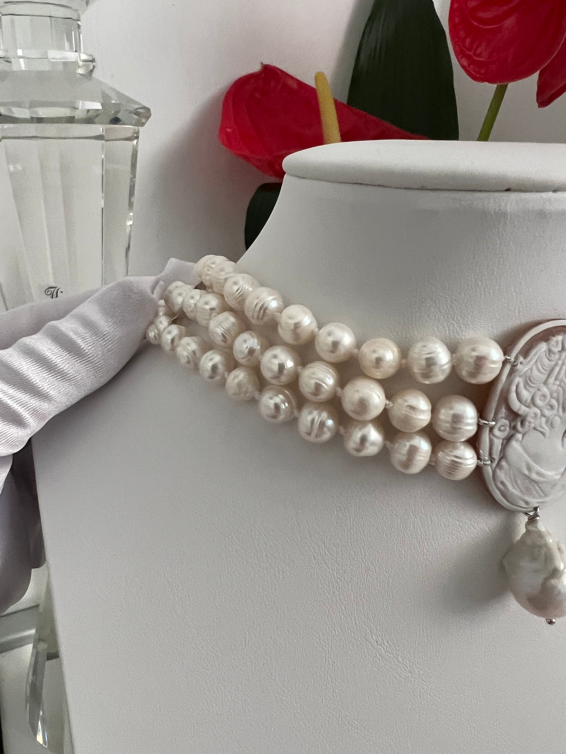 Collarino in perla barocca cameo centrale in conchiglia lavorata raffigurata (figura donna)., perla barocca centrale , chiusura regolabile in acciaio inossidabile .