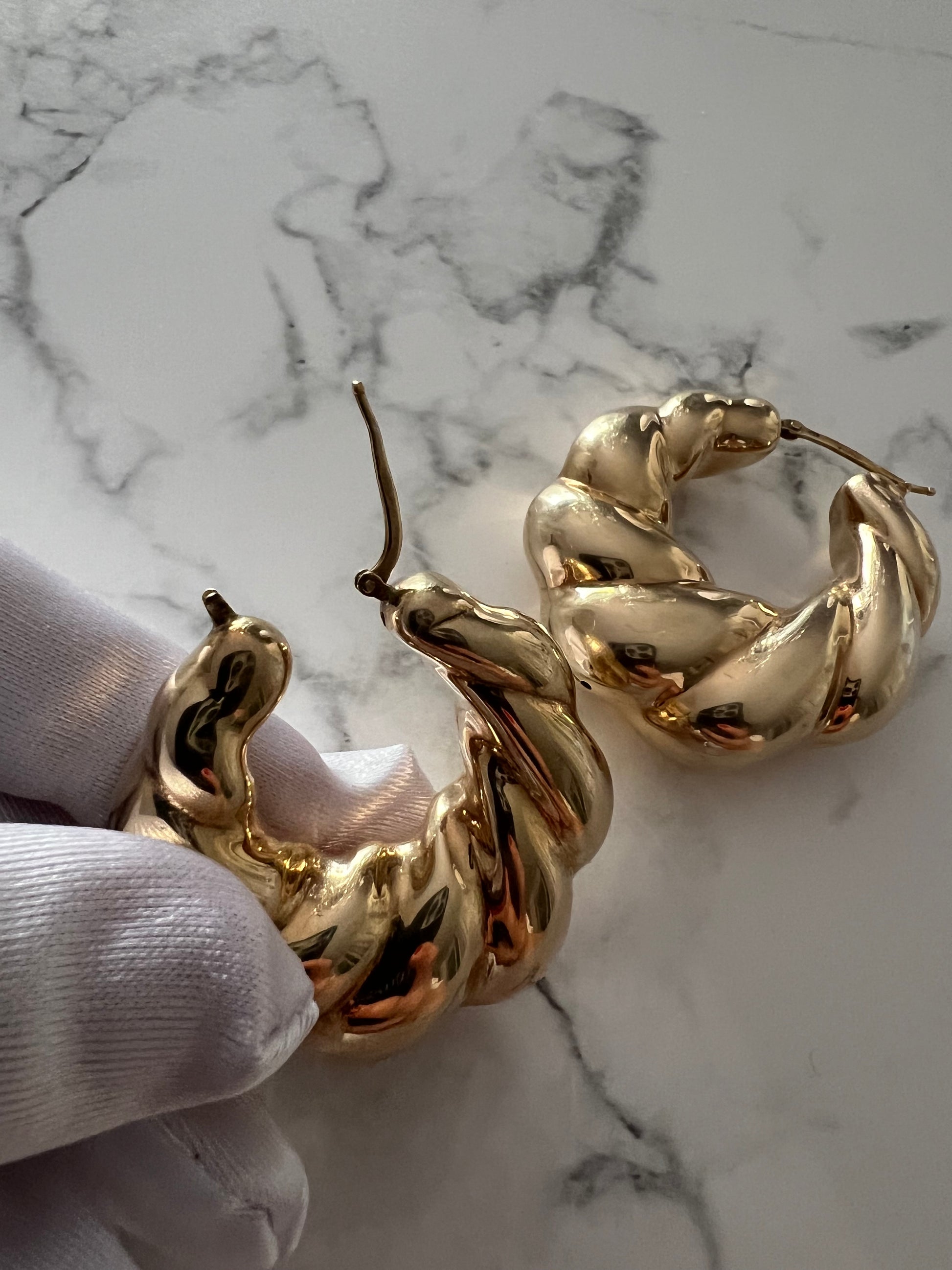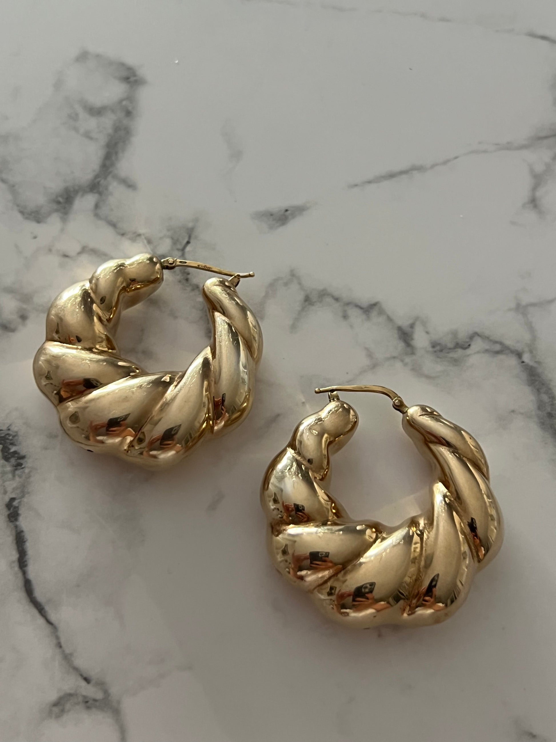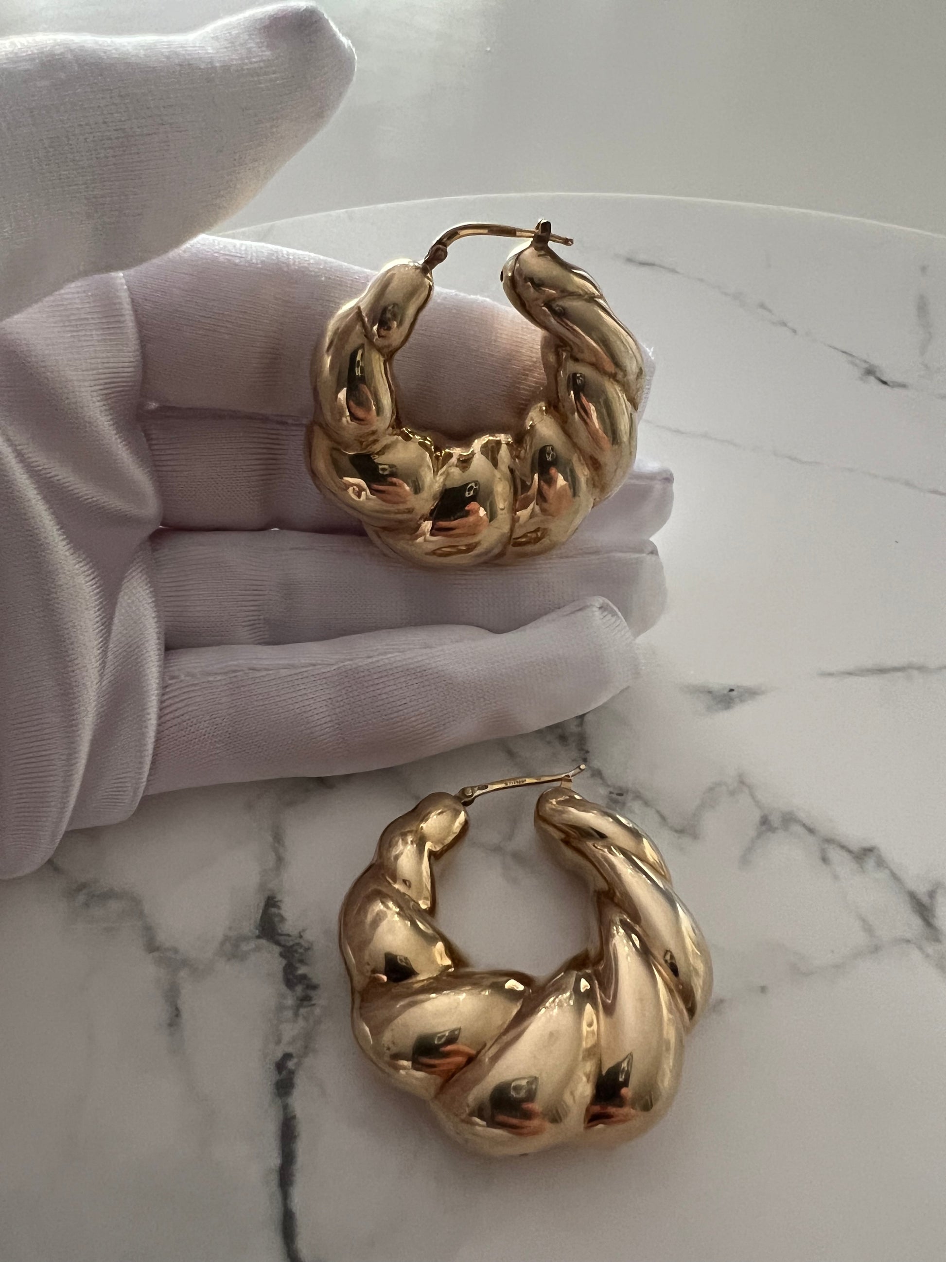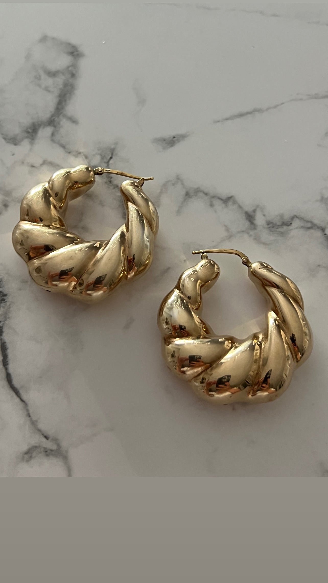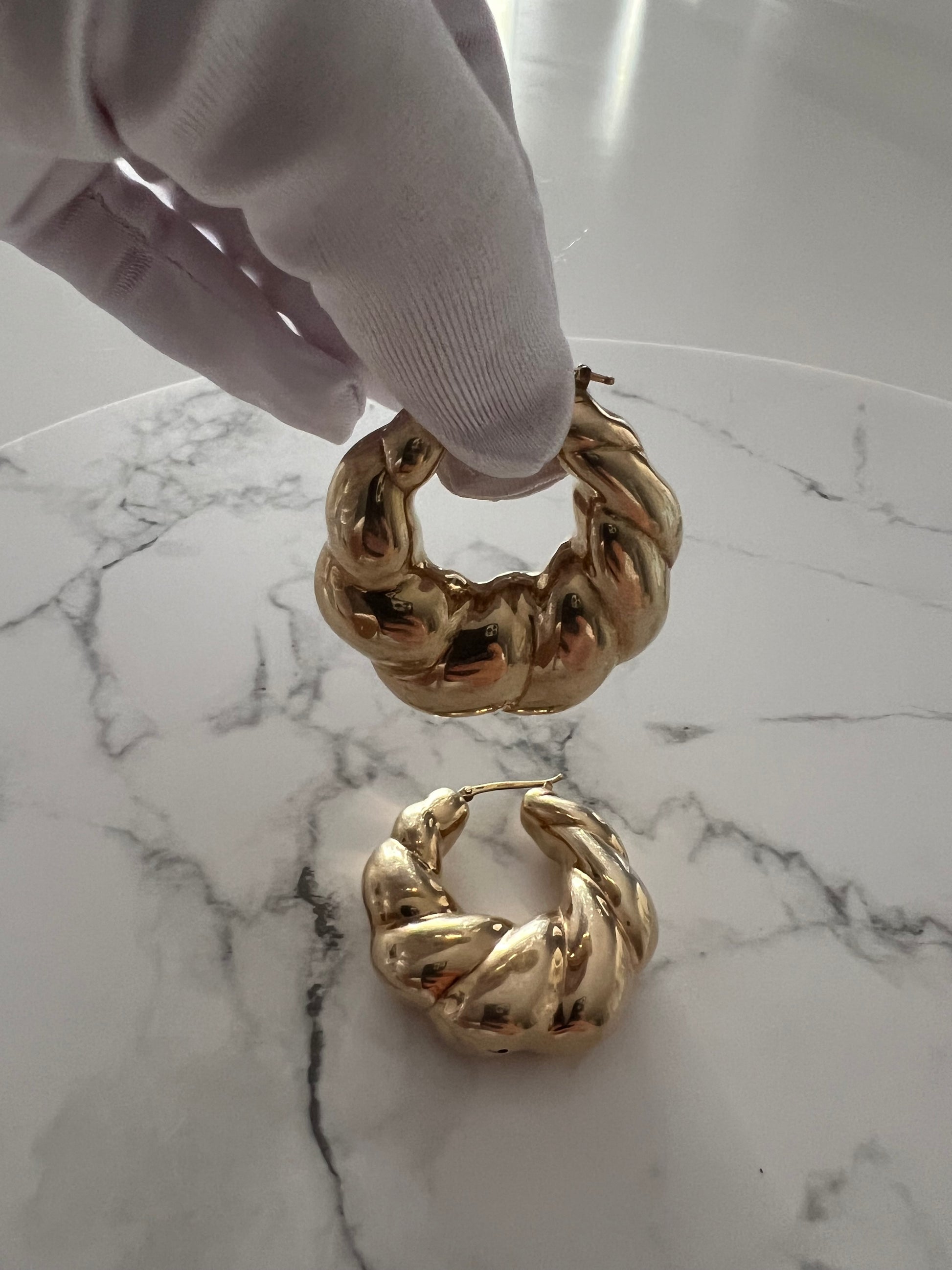 Orecchini a cerchio lavorati argento 925 placcatura oro 18 KT . Chiusura a scatto , Misura (media)